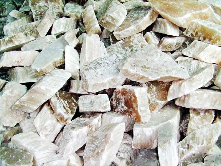 天然硬石膏,又称无水石膏,主要是由无水硫酸钙(CaSO4)所组成的沉积岩石。这种矿石根据化学组成、矿层和成因分为数种石膏。硬石膏的矿层一般位于二水石膏层下面。硬石膏通常在矿物水作用下变成二水石膏,二水石膏在硬石膏中占5%-10%以上。纯硬石膏的化学组成为:CaO41.2%,SO3 58.8%。硬石膏的结晶格子是由每个网格内四个分子组成的单元结构,结晶格子紧密,比其它种类硫酸钙的结晶格子有较高的稳定性。